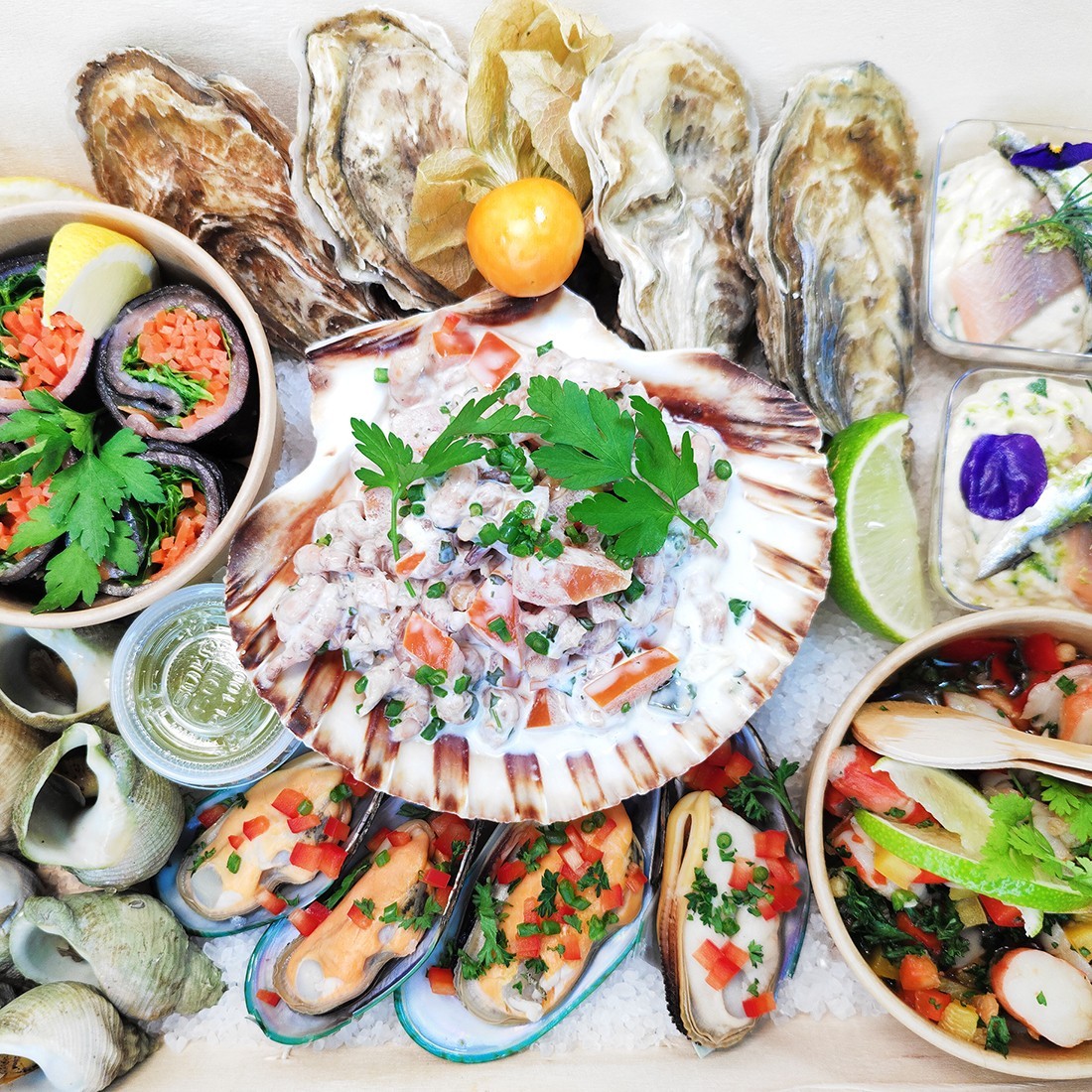 4 huîtres Oysri, 8 bulots, 4 grosses moules garnies, 2 verrines truite fumée et anchois, 4 maki de saumon fumé, 1 salade tomates / crevettes grises, 1 salade scampi en marinade